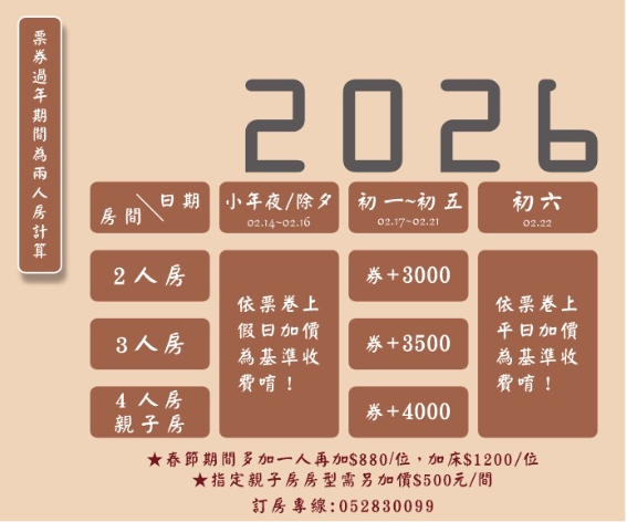 - 連續假日和週六只要持住宿券另+800元就可以入住。