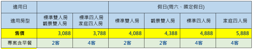 團購享平日標準雙人房升等觀景雙人房、標準四人房升等家庭四人房(升等房間數量有限,以現場排房為主)